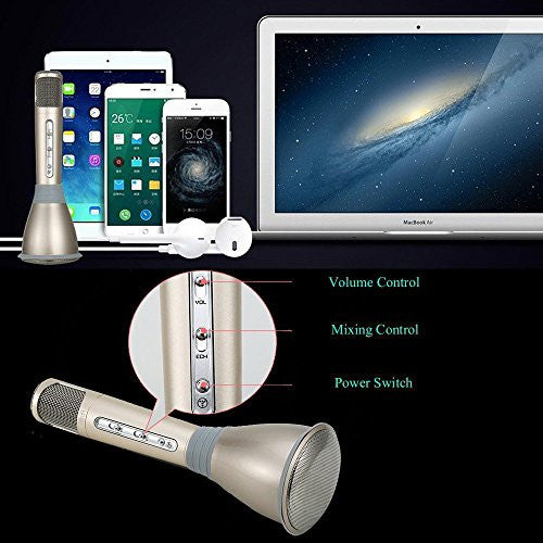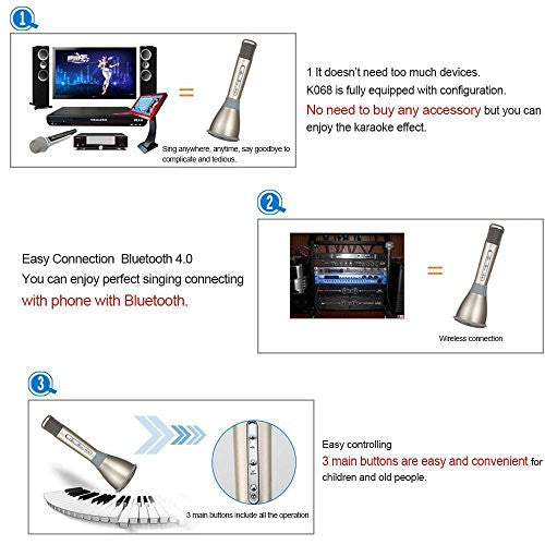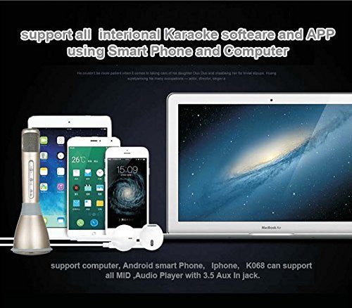 Wireless Bluetooth Connection: easy connection Bluetooth 4.0,you can enjoy perfect singing connecting with phone with Bluetooth.Support computer,Android smart phone,iPhone,K068 can support all MID,Audio Player with 3.5 Aux in jack.